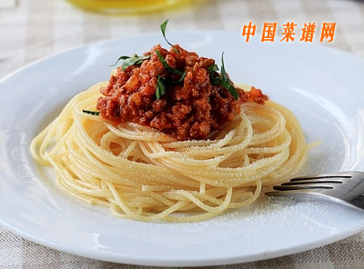 材料牛肉末250克洋蔥半個芹菜半根胡蘿蔔1/4根大蒜1瓣香葉2張百里香1枝番茄意粉醬250ml番茄醬3大匙清水180ml鹽和胡椒適量。
