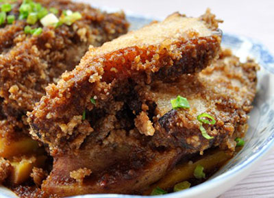 ↓1.鍋內坐水,丟2片生薑進去,將肉塊洗淨放入鍋中開煮,淋入料酒1湯匙,煮至可以用支筷子提起來,起鍋。用竹籤在五花肉皮上扎小孔趁熱抹一層混合醬油。起油鍋,五花肉塊抹一層白醋後入鍋肉炸至金黃起鍋。