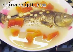 原料木瓜半個,白鯽魚一隻,甜杏仁2錢,鹽,牛奶。做法 1鍋裡放少許的油,放入生薑片煸一下取出。 2將鯽魚用小火兩面煎一下,倒入1碗的水,用大火煮開後,加鹽,杏仁,木瓜切成小塊放入,小火煮20分鐘即可。 3在湯裡再加入一些淡奶能夠去魚腥味,效果會更佳。特點木瓜鯽魚湯是一道女人為自己做的美容湯,成本不過十元,下手不算太狠,只是給自己一分呵護。木瓜杏仁鯽魚都是美容佳品,這道菜味道鮮美營養豐富,值得賢妻良母們偶爾款待一下自己。