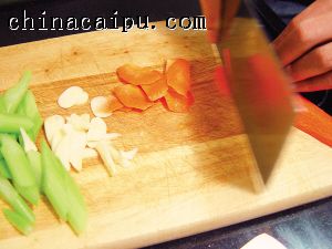 3 燒熱鍋內3湯匙黃油,先放入蒜片和洋蔥片炒香,再倒入紅蘿蔔片和西芹翻炒30秒。