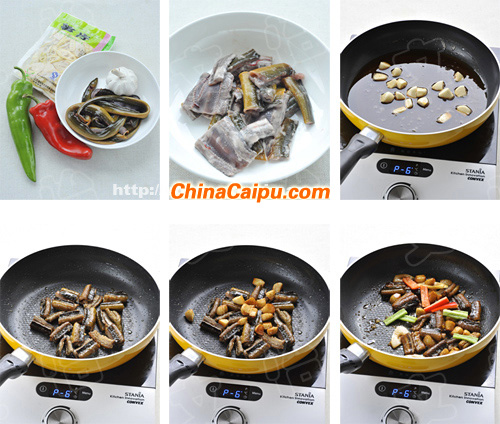 2) 鱔魚去內臟,去骨,洗淨後,切成5cm長的段,瀝干水分後,放入碗中,加黃酒和干澱粉,抓拌均勻。