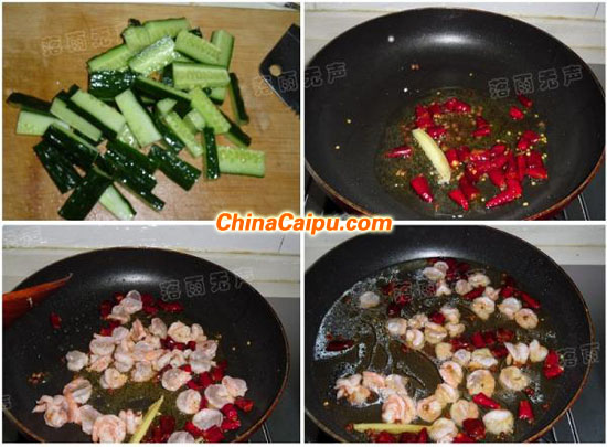 材料明蝦300克黃瓜1條干辣椒花椒生薑鹽料酒生粉雞精香菜葉