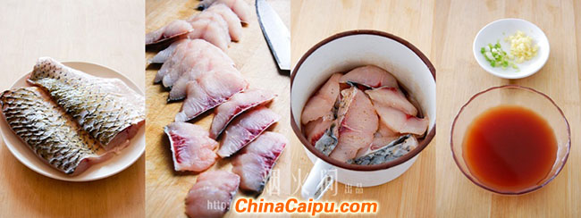 1取草魚中段去骨,斜刀片成大片,調入黃酒鹽白胡椒粉醃製20分鐘入味。