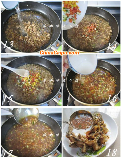 們更喜歡鹹鮮口味的澆汁魚,澆汁裡要放上肉末和蔬菜丁,滋味互相滲透,美味。