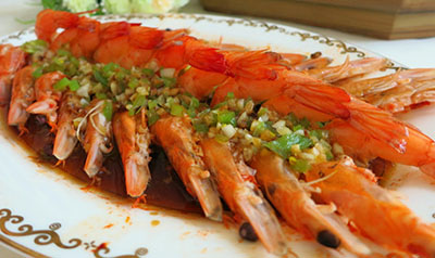 蝦肉沒有放任何佐料,有種鮮甜的柔嫩口感,蝦肉本身略帶彈性的Q滑肉質在蒸魚豉油的輔佐下,爽滑鮮嫩,甜香可人。蝦被擺出華麗的造型,一定會成為桌上一道色香味俱全的奪人眼球的風景線。