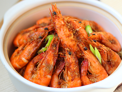 3.鍋中加入1湯勺植物油,加入1湯勺沙茶醬炒香,加入鮮蝦翻炒變色後,加入少許海鮮醬油調味,後盛出,堆在粉絲上即可。