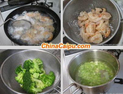3.用熱水燙一遍蝦仁,濾掉水分,用紙巾擦乾。另外把西蘭花也焯一遍,我摳門把西蘭花的根莖部分也切小塊另外焯好。