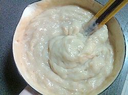 三逐次加清水,用兩雙筷子沿一個方向充分攪拌,每次都等水分吸收再加,知道合適的濃稠度,這個時候在下入沸水就是蝦滑了