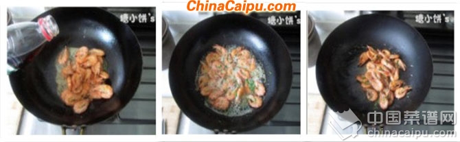 2. 寬鍋熱油~下鮮蝦旺火爆至顏色變紅後撈出控油