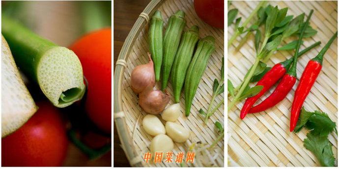 1. 芋頭梗撕去外皮,切段,裡面海綿狀組織很吸湯的味道。稻米草和刺秦切碎。秋葵切段,蕃茄和菠蘿切片。