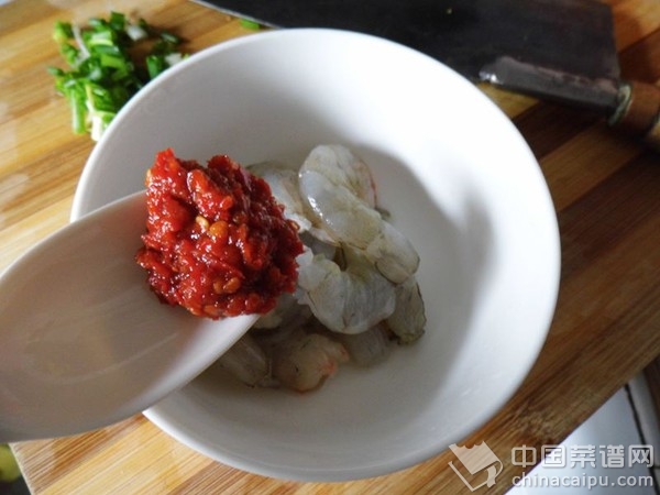 5.用少量的鹽和蒜蓉辣椒一勺1勺料酒醃製片刻