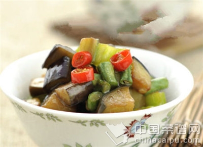 1豇豆洗淨,切成1厘米長的粒。青椒切塊,小紅椒切片。大蒜去皮切片。將茄子去蒂洗淨,切成2厘米大小的丁。