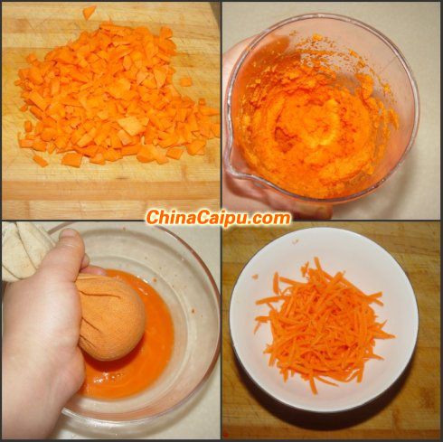 1胡蘿蔔切丁,絞碎,擠出汁液。